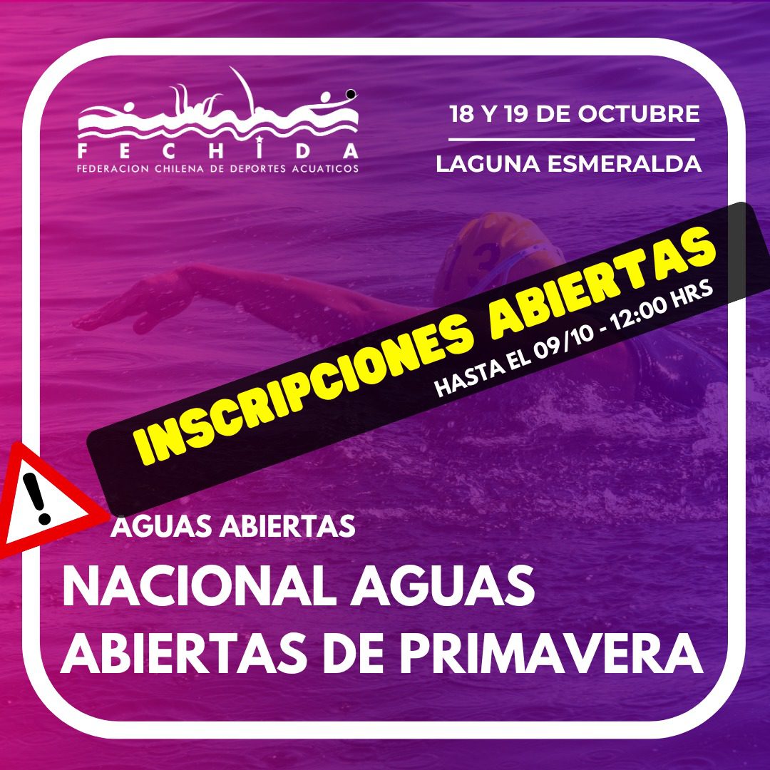 El Campeonato Nacional de Primavera de Aguas Abiertas se llevará a cabo durante el sábado 18 y domingo 19 de octubre en la Laguna Esmeralda, Melipilla. Las inscripciones ya están disponibles.
